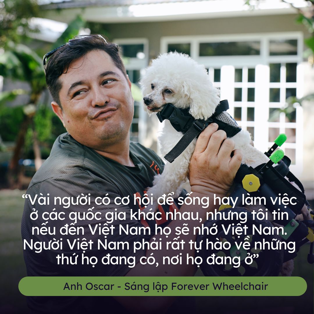 Foreverwheelchair was founded by Oscar Fernando Ruiz Bonilla, a Colombian, and his wife, Thư, a general practitioner from Vietnam. Originating from love, they got married in 2019 and established a center specializing in creating wheelchairs and providing assistance for abused, abandoned, and disabled pets.
